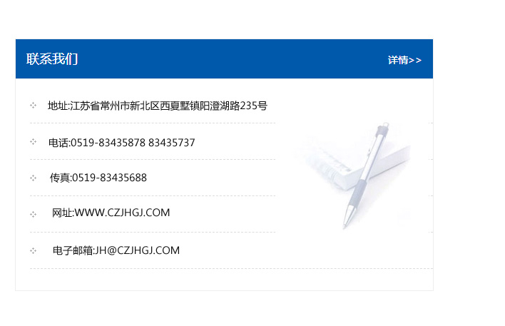 地址:常州市新北區友邦商務大廈1幢16、17層  電話:0519-85101652  傳真:0519-85112595  郵編:213022  網址:www.cz-jiayue_cn.ylszb.com  郵箱:xiajifengaa@163.com